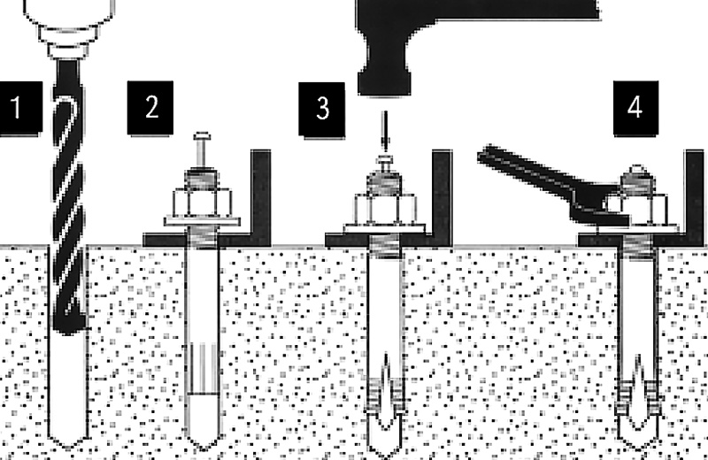 Percutiat ancoras disposito anchoring in concreto. Inserere ad percutiens ancoram in pre-munitiones foramen in concreto. Set anchoram a striking clavum in anchoram. Clavus expandit ad percutiens ancora in concrete.